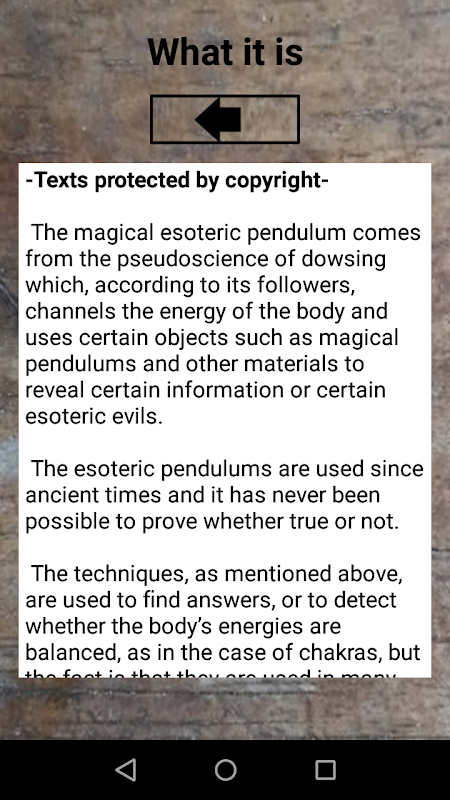 With this wonderful application you can discover how an esoteric pendulum works and understand a little more about this mysterious world of pendulum or dowsing.