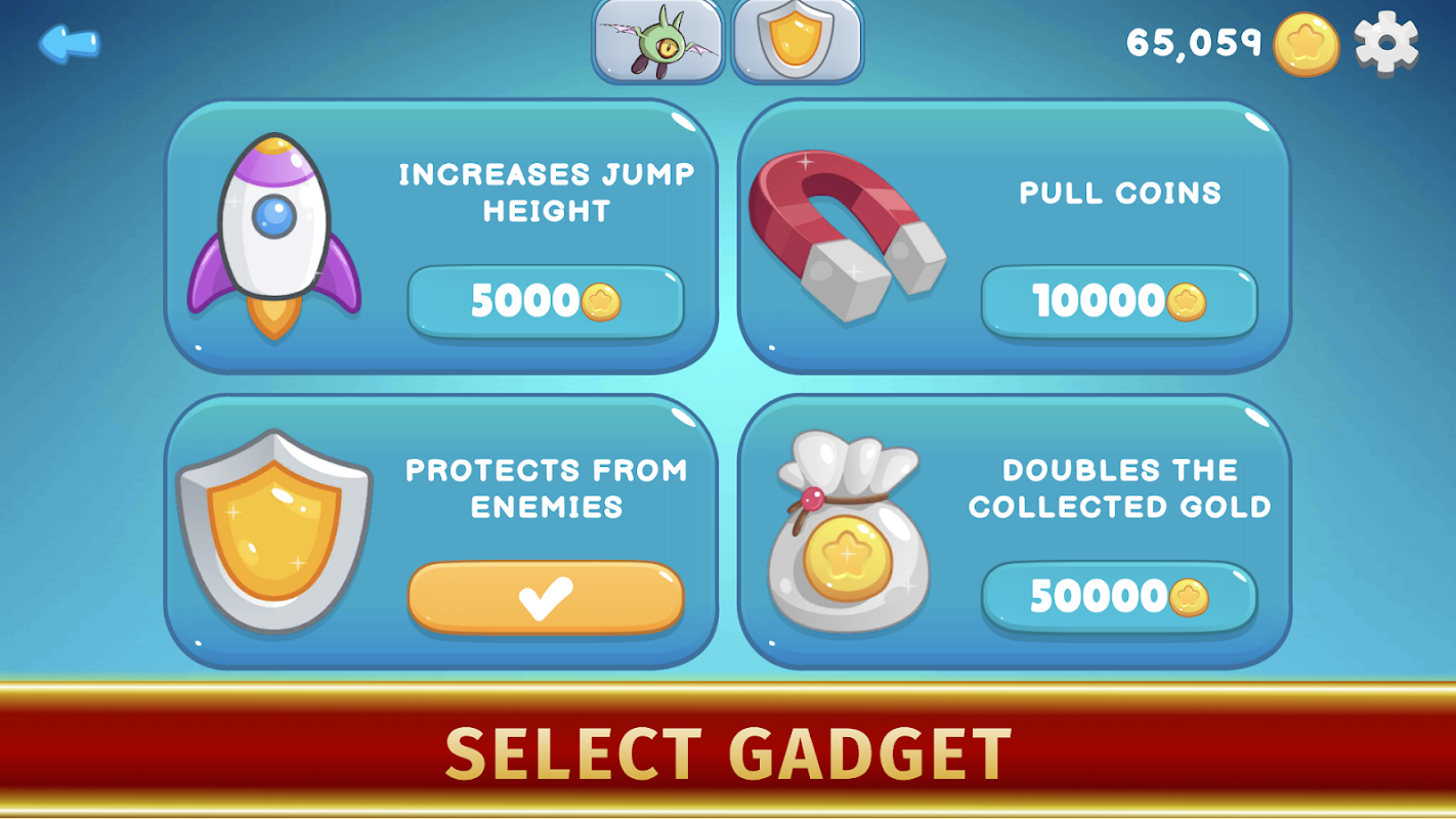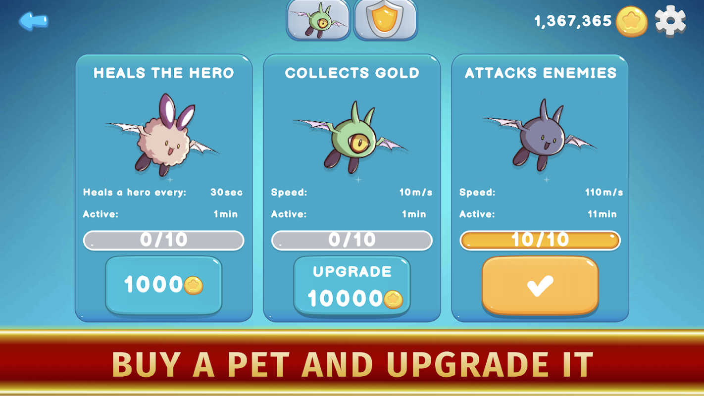 You can purchase a pet to enhance your hero. There are three of them in total and they are all different: one helps to collect coins, the second attacks enemies, the third heals. Each of them can be upgraded. You can only choose one of them to pass a level.