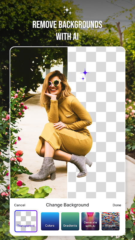 2. Change Background: erase backgrounds for any subject; people, products, pets, cars, furniture and any other item in a photo. Keep a transparent background, or add a black, white or coloured background. Or even add the subject to any setting that you can imagine with AI generated backgrounds! *