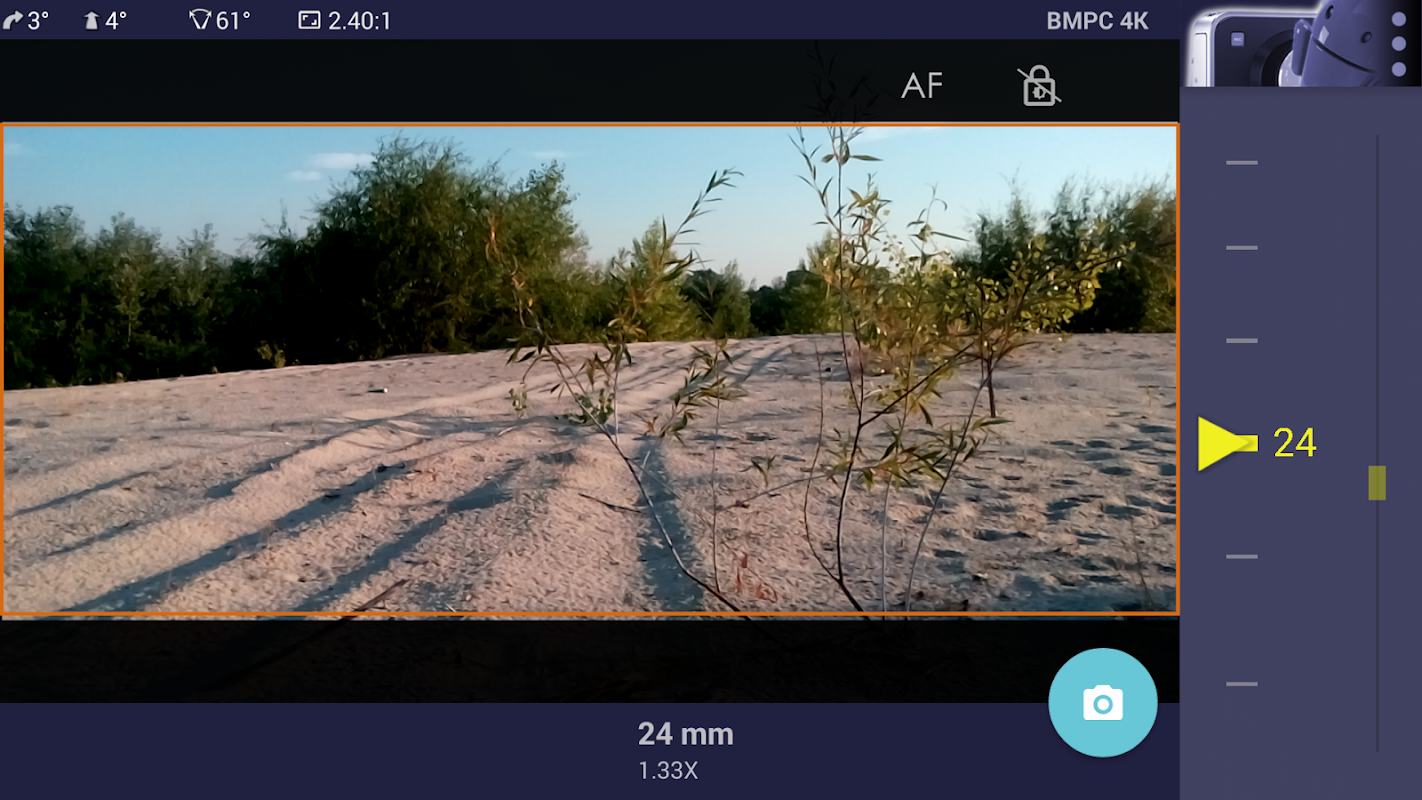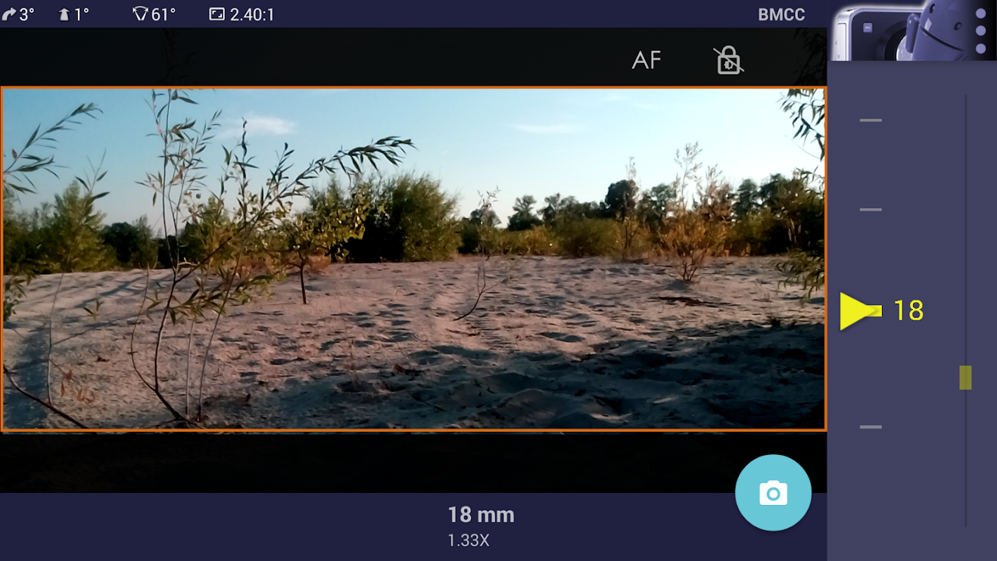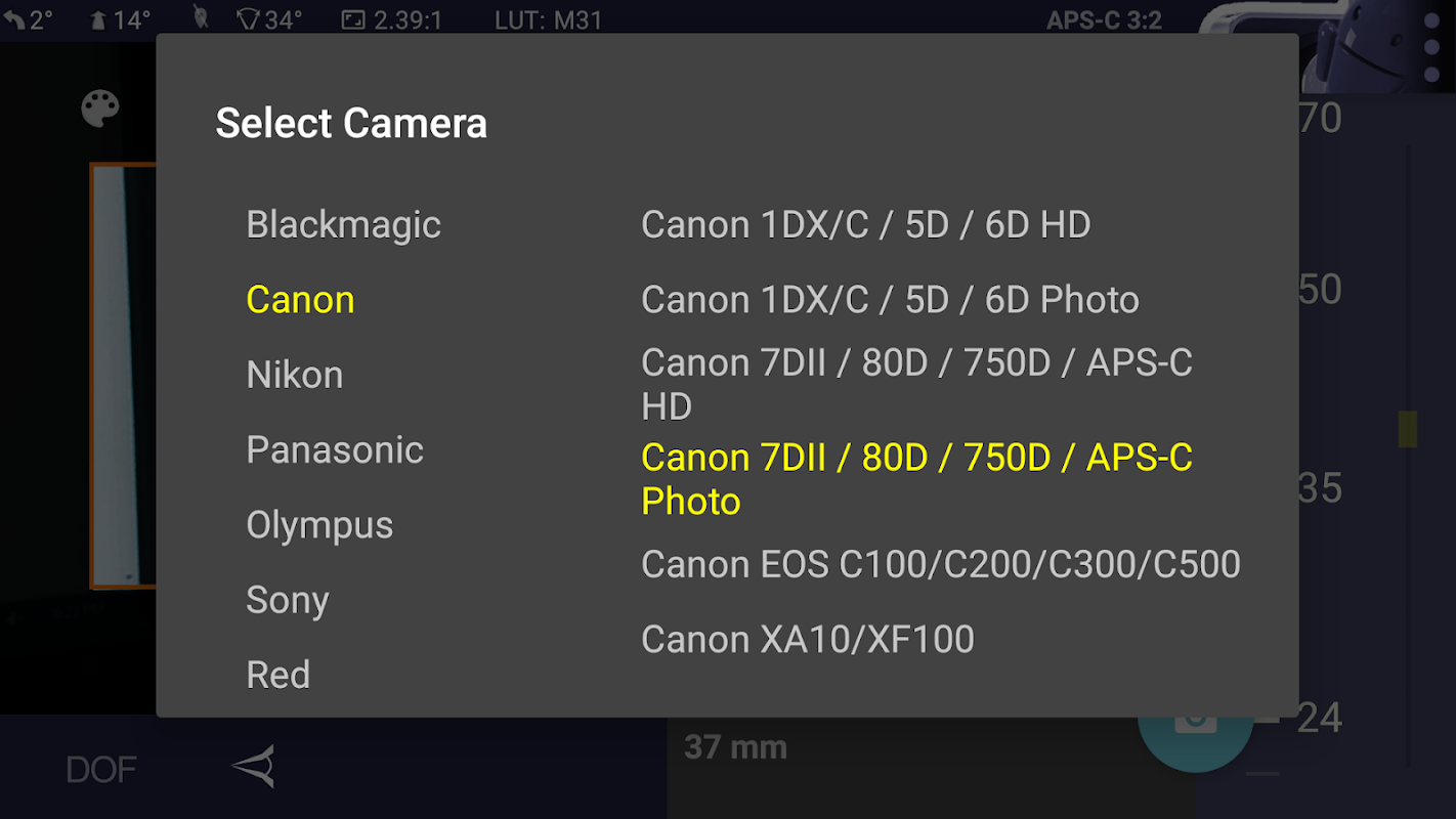 The app is a digital director's viewfinder -- it helps you see the exact field of view for your future shot. Select the camera from the menu and rotate the wheel to select the focal length of the lens.