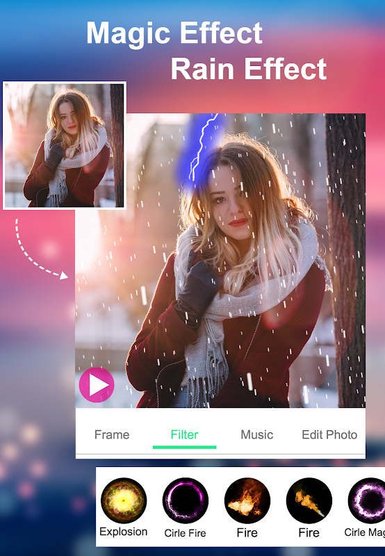 - Apply Animation Magic Effect into photo like: Fire Effect, Explosion Effect, Light Magic Effect, Rain Effect, Snow Effect, Heart Effect....