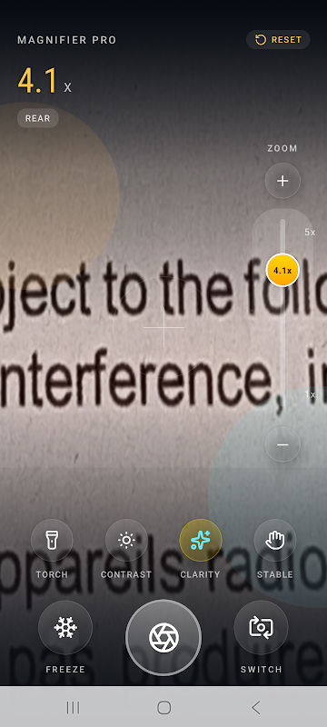 Magnifier camera with zoom, freeze, torch, and clarity tools.