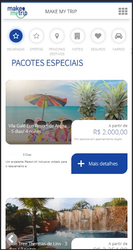 O aplicativo da Make My Trip é totalmente grátis e com ele você pode ter acesso aos nossos pacotes, hotéis, passagens aéreas, locação de veículos e muito mais.
