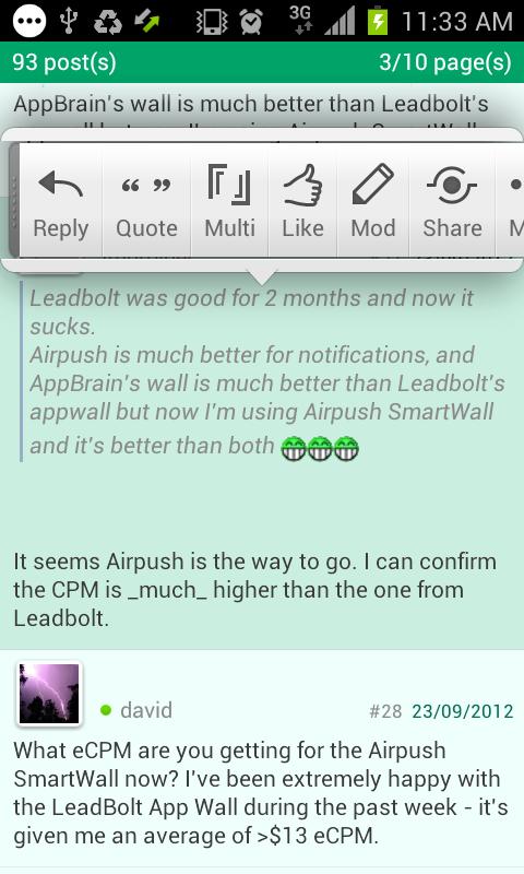 A wealth of information is available about all the major ad networks including AdMob, LeadBolt, Tapjoy and Airpush. Share your income stats with other developers, and see real-life performance figures.