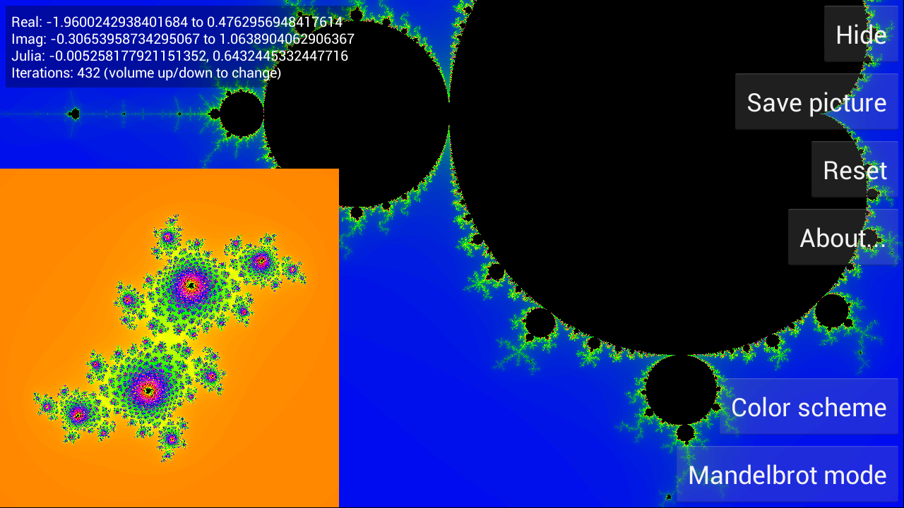 A fast and powerful app that lets you explore the famous fractal known as the Mandelbrot Set. Allows you to pan and zoom (with tap and pinch), and change the number of iterations with the volume up/down buttons. Also allows you to preview the Julia set corresponding to any point on the Mandelbrot.