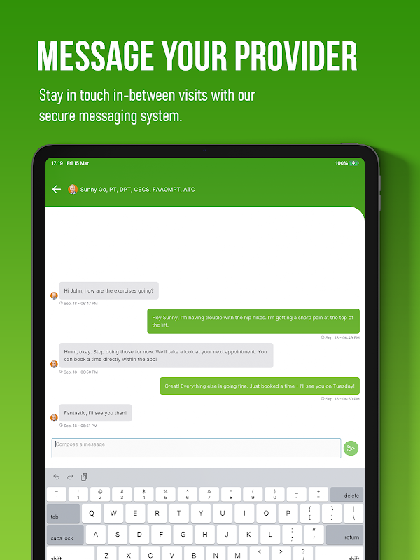 Using this app, you can access your personalized Home Exercise Program with HD Instructional videos. On the 'Messages' tab, you can securely communicate with your Manual Touch provider. As you complete your exercises, we'll give you trophies and medals to celebrate your progress!