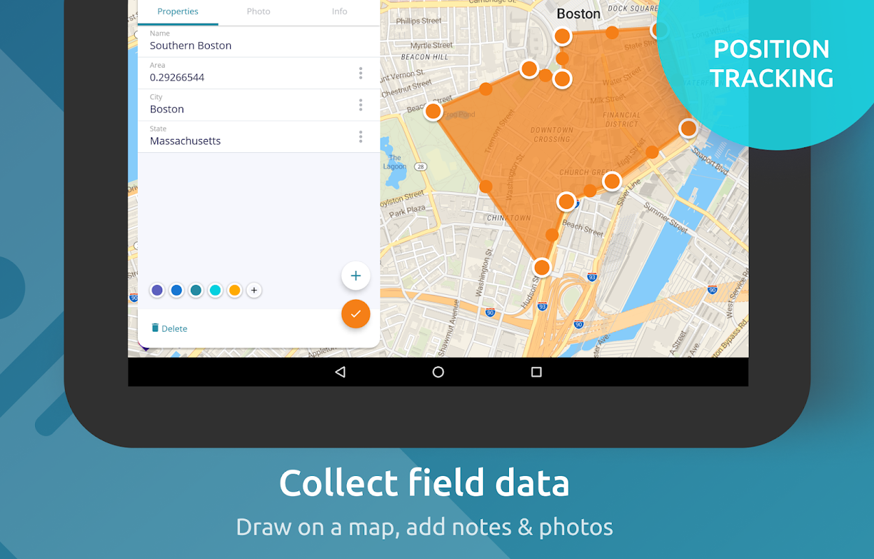 See your GPS position on your own maps. Draw points, polygons and lines on the maps. Collect field data and notes related to a location, attach a photo and fill custom properties.