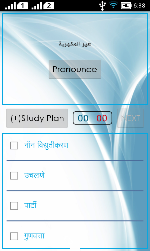Marathi <> Arabic Dictionary ( Both Marathi to Arabic and Arabic to Marathi ) 100 % offline and free . You can search both Arabic and Marathi words. You can search words directly from “Internet Browser” or other Applications by Sharing option. In sharing option you will find “Marathi Dictionary” and choosing “Marathi Dictionary” will open the dictionary with the shared word so you need not type and exiting from dictionary will return you to “Internet Browser” or other Applications again. This is not only a Dictionary but also a learning tool. You can use this dictionary when you have no internet connection. MCQ (Multiple Choice Question) option available. There is auto suggestion so you need not type full words. You also can use Speech to text feature . You can add words to study plan. And also you can remove words from study plan. You can turn on/off auto search going to setting of the app. So low profile Mobile handset can turn off Auto search to type quickly. You will see Dictionary icon on notification bar to start app quickly. On sharing text you will find Marathi Dictionary. This will be helpful to find out meaning of any word.