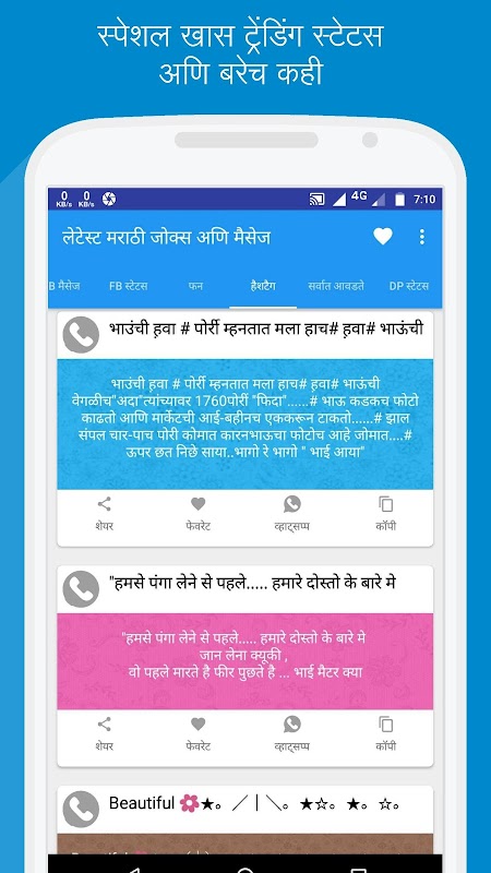 This App contains all kinds of Marathi Language Jokes, Message, status, and Funny DP status, funny photo, and Famous Facebook Pages. If you are feeling bored or having sad day just read this jokes and make yourself happy. You can also share this messages with social networking.