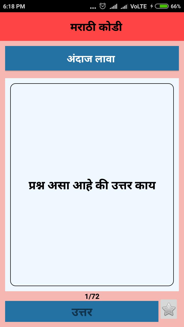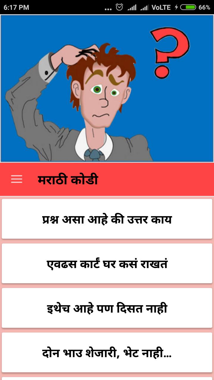 १.मराठी कोडी या अँपमध्ये तुम्ही एकदम मजेशीर कोडी पाहू शकता. लहाणांपासून ते मोठ्या व्यक्तीपर्यंत अगदी वेड लावणारी, गमतीशीर कोडी दिलेली आहेत.