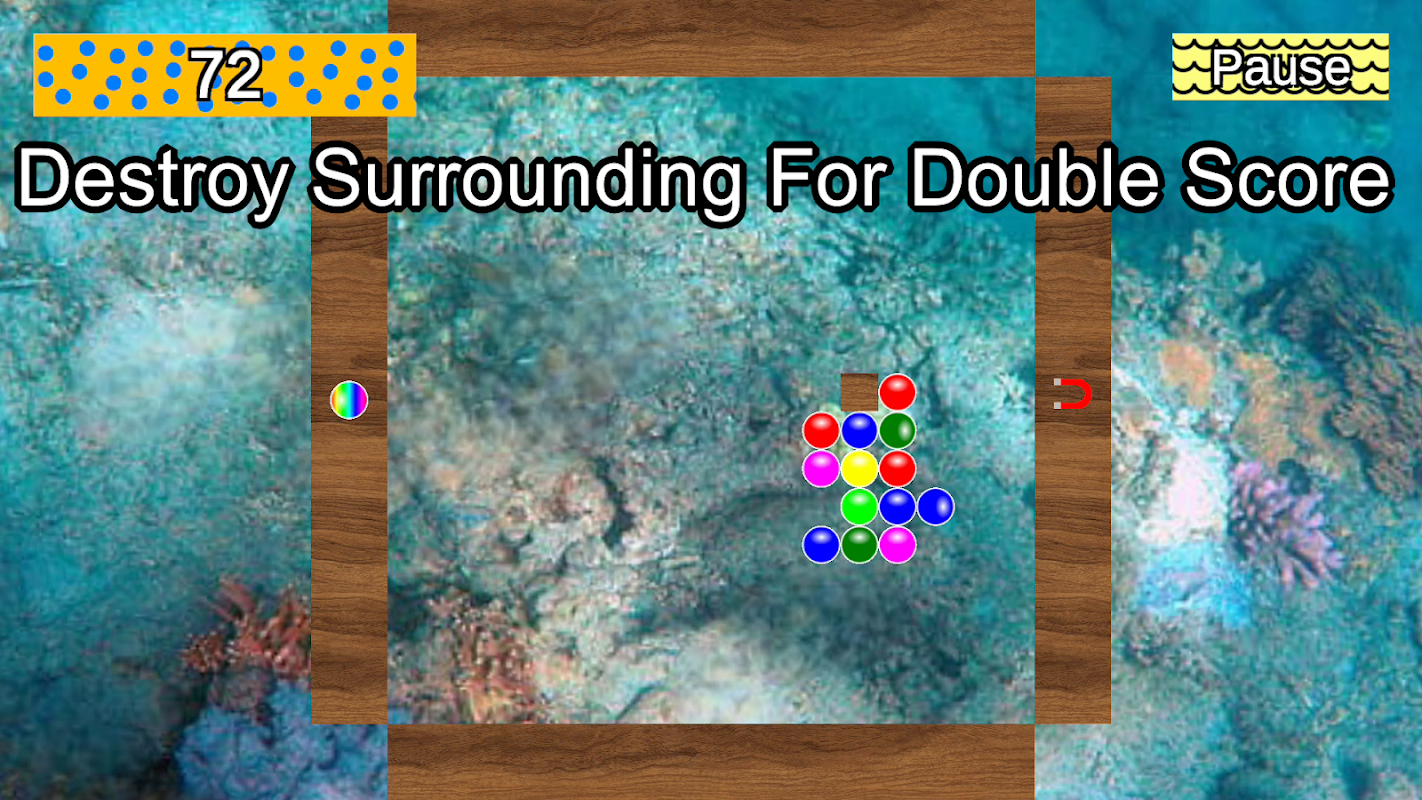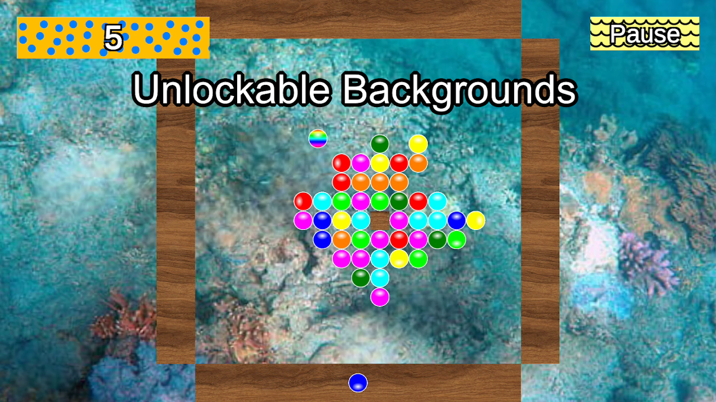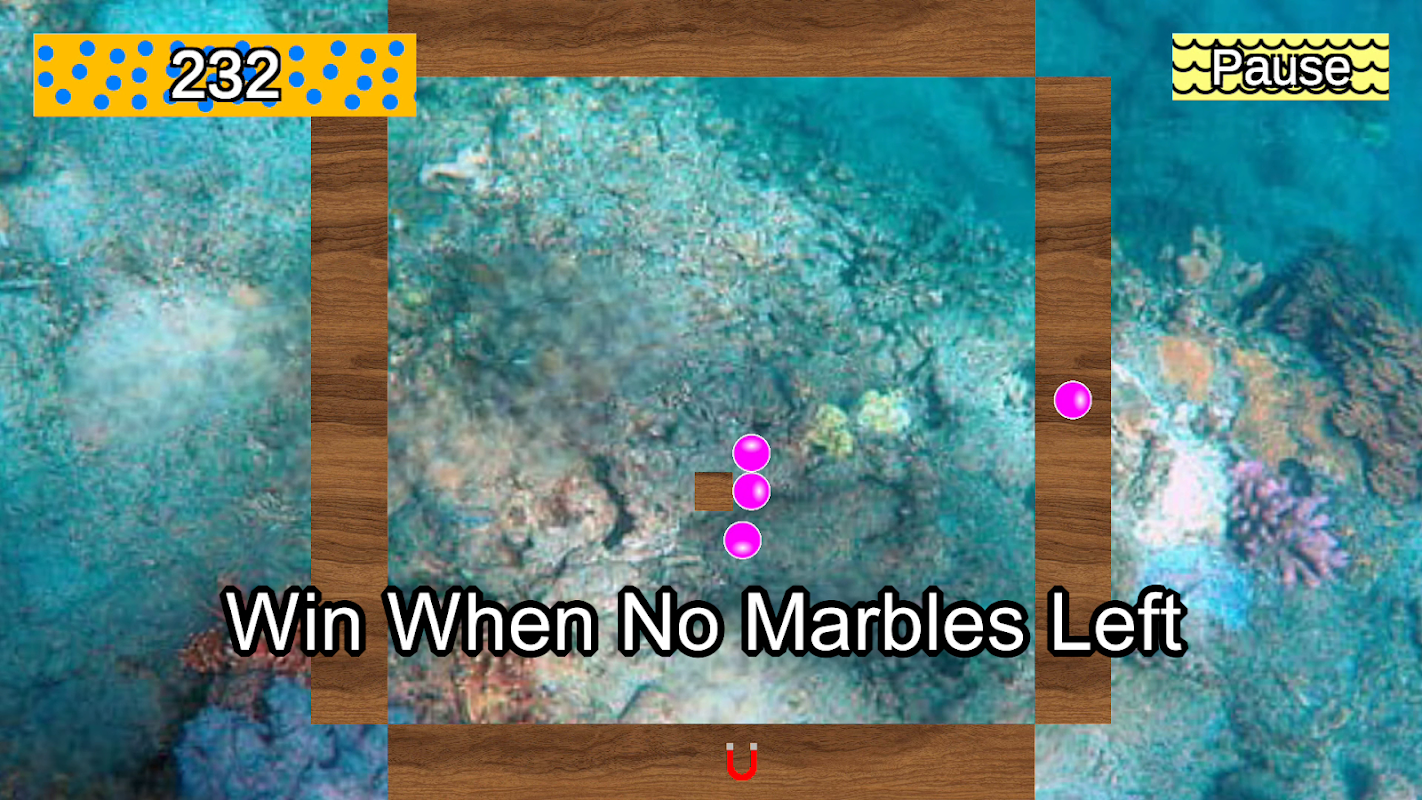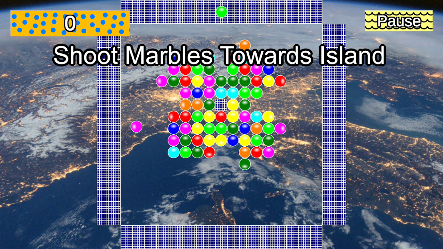 Marble Islands is a puzzle game where you shoot marbles toward matching marbles on the island. But when marbles hit the island it floats away. So you have to lead your shots towards the island. When you create a group of 3 or more marbles of the same color they are destroyed and game score is added. When marbles have nothing surrounding them they are destroyed and double game score is added. When there are no marbles left you win. When you win a game, that game's score is added to the total score. The total score can be viewed in the shop where you can also use it to unlock new backgrounds. There are two power-ups that are randomly given. The rainbow marble turns into the color of the marble it’s placed on. The lava marble destroys the marble it’s placed on. The magnet attracts the island toward the wall it's placed on and is destroyed when it hits it. But be careful as if the island or any marbles hit a wall that has no magnet on it, game score is removed. When you run out of game score the game is over.