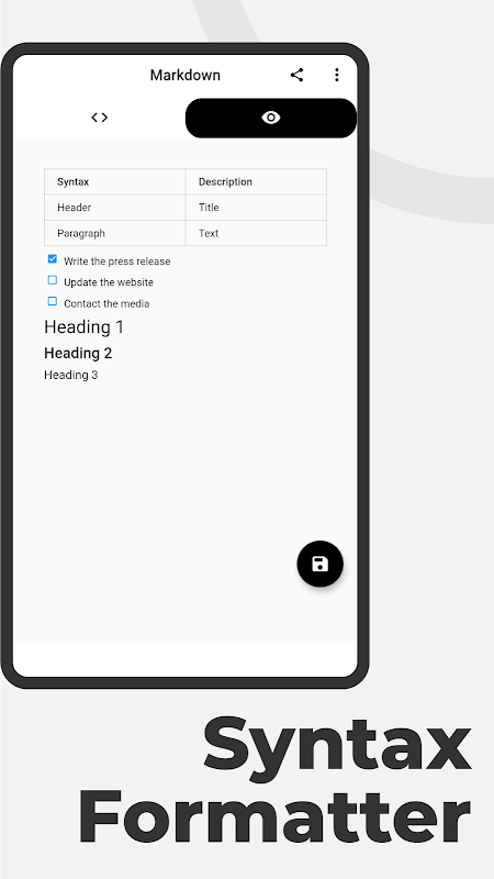 Create, open, edit and share markdown files on the go with syntax formatter.