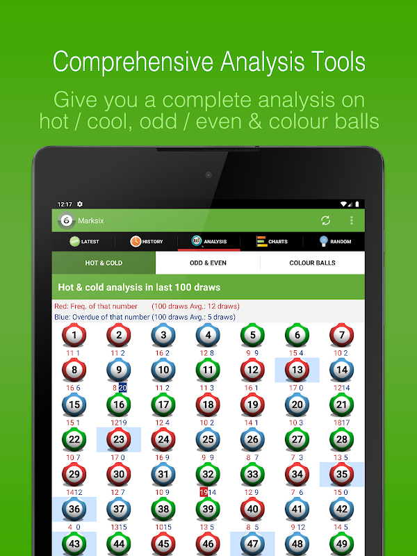 - Number analysis: Provides last 100 draws number analysis includes hot & cool, odd & even based on statistic calculation and color balls analysis.