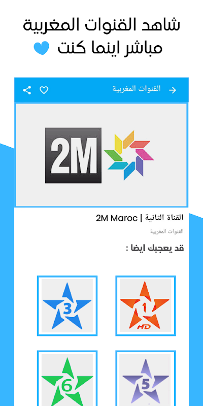 The application of Moroccan channels comes with many features about direct TV, Moroccan channels, because it was specially designed to make it easier to navigate between 2m tv maroc live, with a few clicks you can choose what you want about Moroccan channels, live broadcast without many complications. So it collects all Moroccan TV TNT in categories divided under the name of the Moroccan TV classification - tv maroc. With a place dedicated to settings so that the user can choose priorities according to what he wants, with the possibility of all maroc tv tnt maroc in a section named Favorites in order to quickly reach this section and watch Morocco TV.