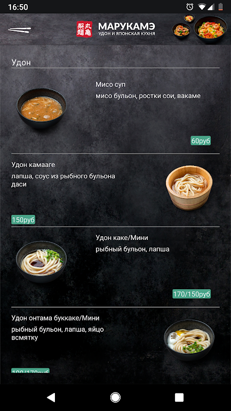 В наших ресторанах все блюда готовятся на открытой кухне, что позволяет каждому гостю проследить весь процесс готовки, начиная с добавления в муку воды и соли и заканчивая уже готовым изумительным блюдом. Соблюдая принцип открытости, нам и удалось развить направление «Марукамэ». Мы тщательно выбираем все продукты и ингредиенты, большинство из которых импортируются напрямую из Японии. Готовя каждое наше блюдо и вкладывая в него всю нашу любовь и страсть к японской кухне, мы, изо дня в день совершенствуемся и стремимся к достижению идеального вкуса. Благодаря тому, что мы придерживаемся этих правил, нам удается передать гостям истинный традиционный вкус японской лапши удон.