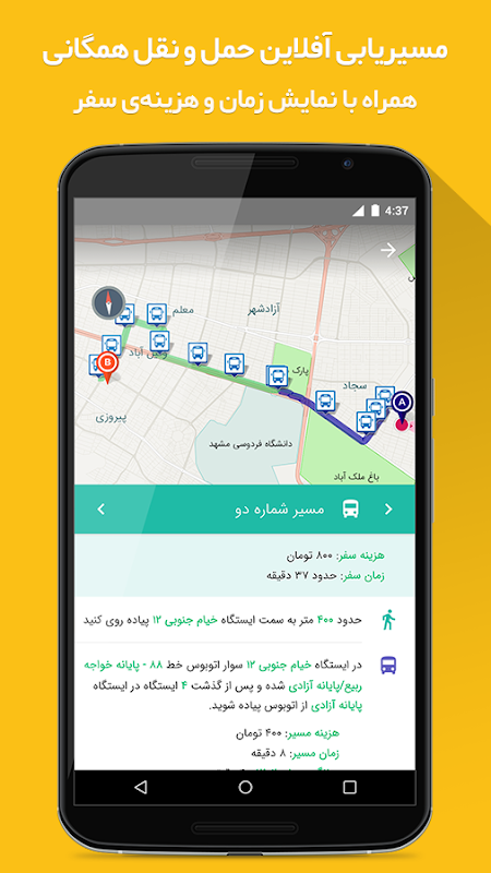 Mashhad traffic and transportation map targets citizens, pilgrims and tourists of mashhad and tries to help them in urban travels by displaying information about current status of transportation. Never be blocked in traffic jams by checking traffic status of your route before departure. You can also find best routes of public transit to reach your destination efficiently.