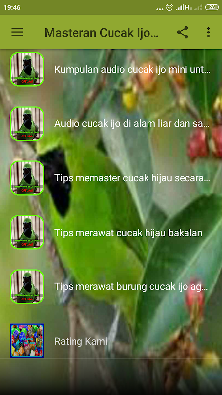 Satu aplikasi Masteran Cucak Ijo Gacor Terbaru bisa kita dapatkan melalui hp Android Anda masing masing dengan mudah, Audio masteran untuk melatih Cucak Ijo agar bisa ngekek panjang khusus untuk Anda semua dimanapun berada. Terkadang kita kesulitan mendapatkan Download Suara Cucak Ijo Gacor Mp3? Kesulitan untuk mendapatkan Download Suara Cucak Ijo Ngekek Panjang Mp3 saat ini? Berikut ini adalah kami sajikan Special Suara Kicau Burung Cucak Ijo Gacor Untuk Masteran yang menjadi sebuah rujukan penting untuk Anda semua. Melalui aplikasi Suara Cucak Ijo Betina MP3 selain itu dapat juga secara mudah untuk dipergunakan melalui perangkat Android Anda masing masing.