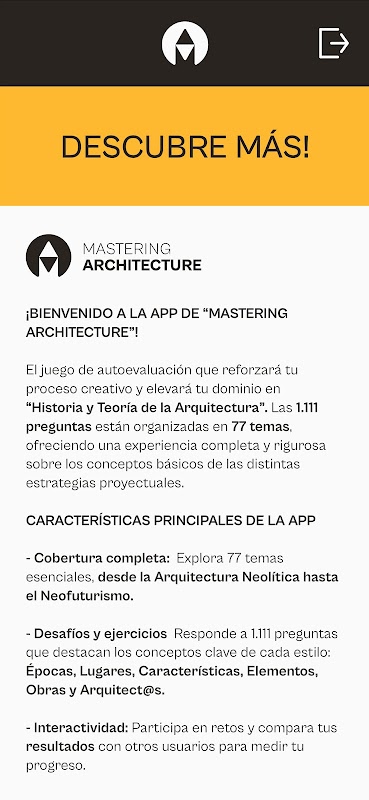 MASTERING ARCHITECTURE is a quiz game designed for you to master the History and Theory of Architecture quickly, efficiently and entertainingly. The app uncovers all the questions integrated in the book “Essential Questions about Theory and History of Architecture; Styles and Currents” available on Amazon. In addition, the book has been reinforced with the prologue by the 2017 Pritzker Prize laureates; RCR Architects.