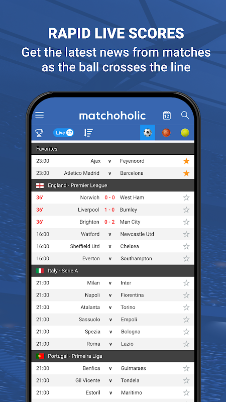 The fastest goal notifications, live results, detailed statistics, in-depth team comparisons and player profiles are in your mobile with Matchoholic.