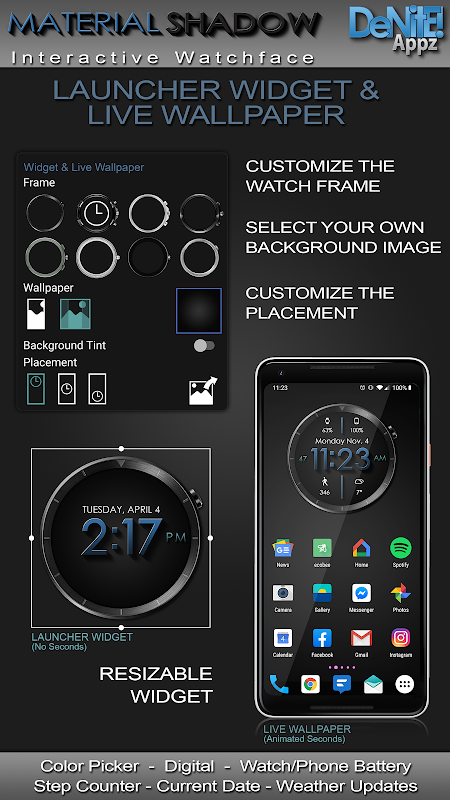 This completely customizable interactive HD Wear OS Watch Face, Clock Widget & Live Wallpaper brings a classic elegance to your wrist and Launcher. Features include custom complications, battery levels, weather conditions, step counter, color picker & date information. A settings app will also be installed on your mobile device to configure the watch face for any look you desire. Select any color and create a completely custom look for yourself! Don't have a Wear OS watch? No Problem! You can use the clock widget or Live Wallpaper on your launcher!