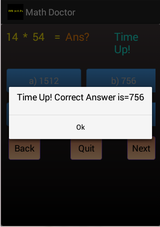 In this application there are two levels level1 and level2.In level2 there is less time to decide answer.in this advance math game + there is question with four answers ,user has to select any one answer then message will come saying that selected answer is right or wrong. If user unable to calculate answer in specified time limit then at last there message will appear with correct answer.