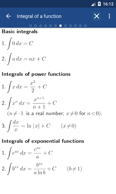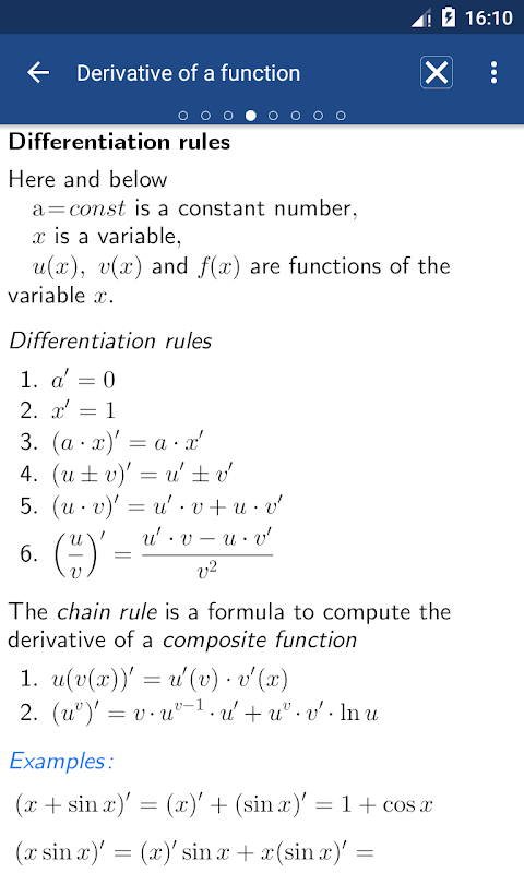 The reference book includes a theory, definitions and formulas of the school-level algebra and calculus. It is useful for study and test preparation. Can be used as a cheat sheet with a quick search and app close button.