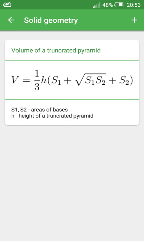 In the app Math Formulas you will find Algebra formulas, Plane geometry formulas, geometry formulas, Solid geometry formulas, trigonometry formulas and much more to help young students to learn this amazing and mysterious science. There is math formulas for all classes.