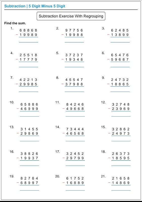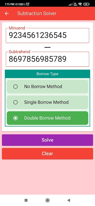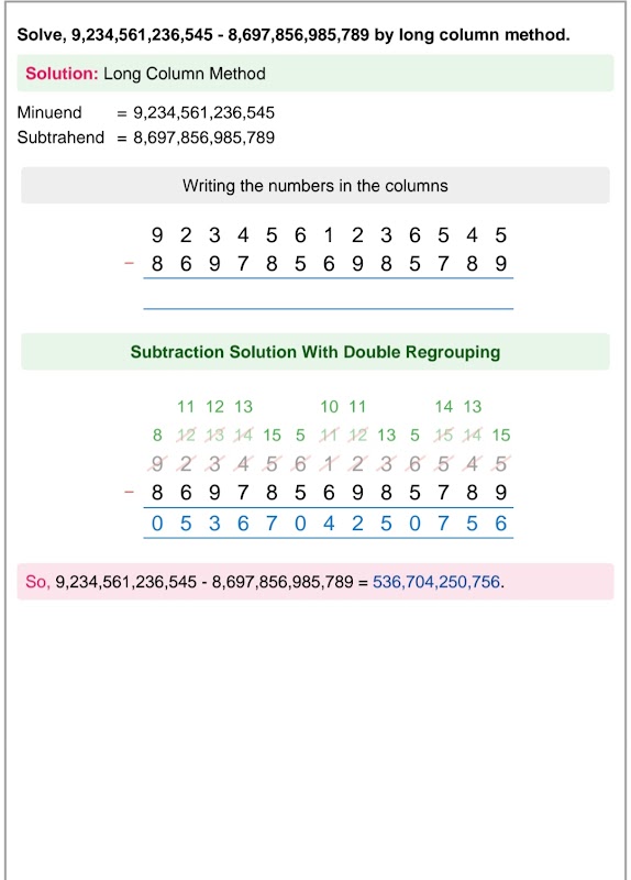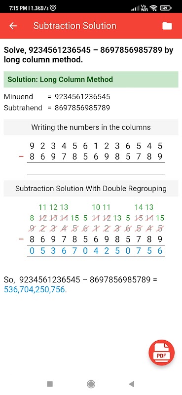 This app solve subtraction sums in long method or column method. This app subtract upto 18 digits. This app also designed to generate subtraction worksheets in printable pdf. This app is capable to generate pdf worksheets with answer keys with single or double regrouping method.