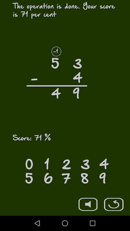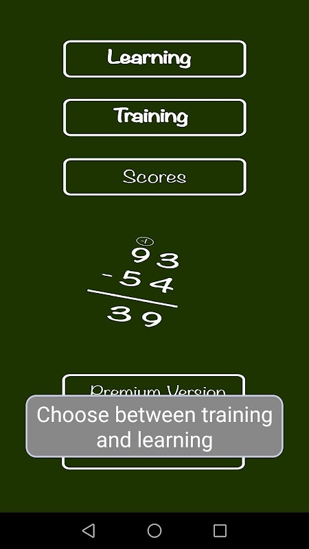 In training mode, you do the long subtraction step by step by yourself. The application detects the mistakes, such as forgetting the carry. It gives you indications if you need all along math exercises.
