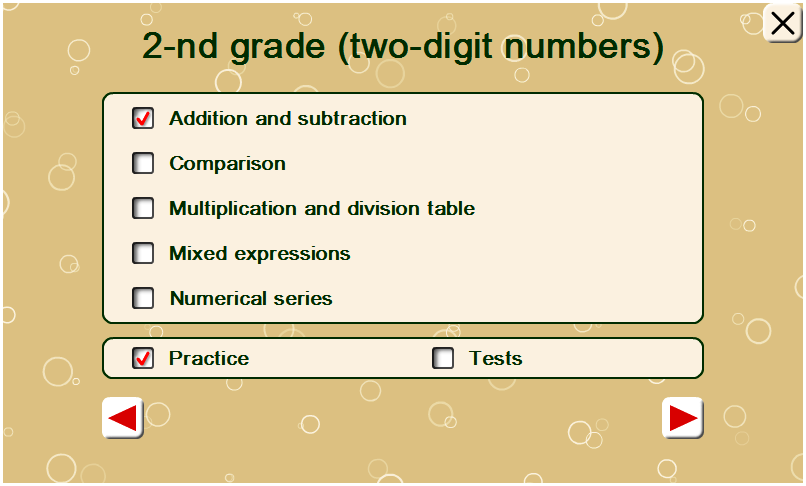 All the math exercises are grouped by levels. The higher is the level, the more difficult the is calculation. To move to the next level you must correctly solve all the exercises of the current level.