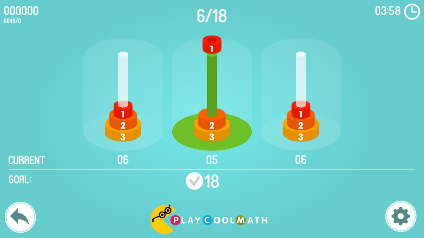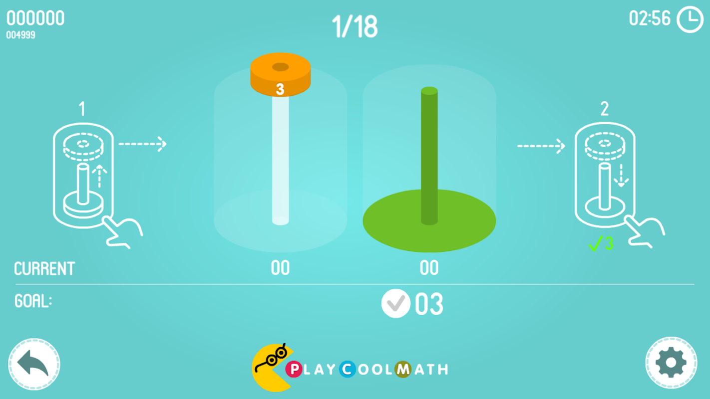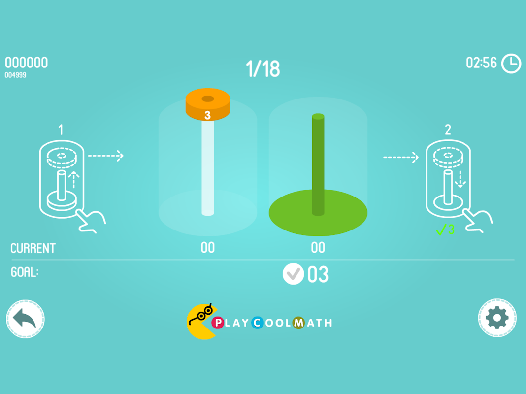 Based on classic puzzle, we created a game called Math Tower of Hanoi. The game contains of 18 levels - from simple ones to complex ones. The smallest disk has number 1 on it, the next disk is larger and has number 2 and so on up to the largest disk that has number 8, accordingly. The main goal of this game is to move the disks so that the amount of the digits on all the disks in the bars would match the target. The fewer steps you make during the game, the more points you will get for the puzzle. You are allowed to move only one disk at a time. You cannot put a larger disk on a smaller one. You will get other math tasks between the levels. Play and improve your skills in mental counting.