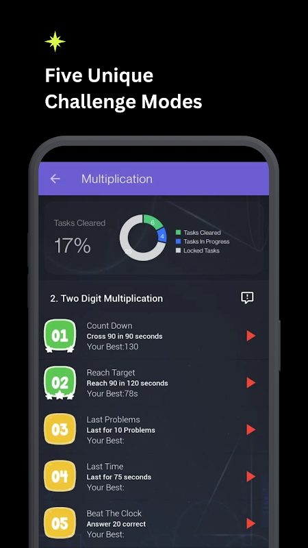 Engage in a series of math games, interactive tasks & exercises that challenge your brain, improving your math proficiency. This game isn’t just for kids — it's built as an advanced math workout for adults and math learners. Consider it your personal Mental Math tutor, boosting your speed and accuracy in mathematical calculations. It contains a series of challenges based on math tricks that acts as an excellent math exercises for your brain.