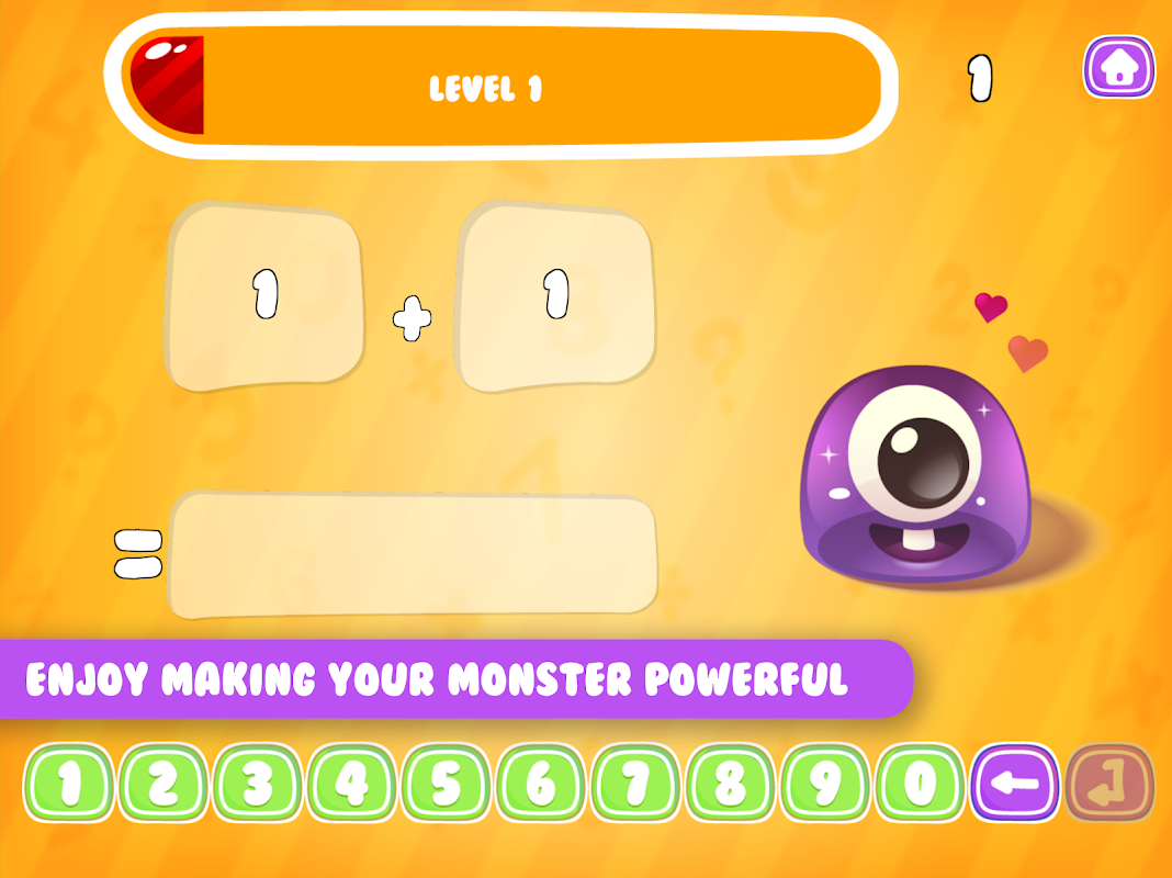 Play along with the awesome monster character and reach higher levels! The monster in this kids learning game gets bigger and more powerful depending on the level you reach. For example, when the character reaches level 2 the - category will be unlocked and when the character reaches level 3 the other + and / will be unlocked. Unlock new levels and collect more points! The more points you collect in this cool math game, the higher level the character gets. Once the monster becomes powerful enough, the math problems will become more difficult all the way up to 4 fields questions!