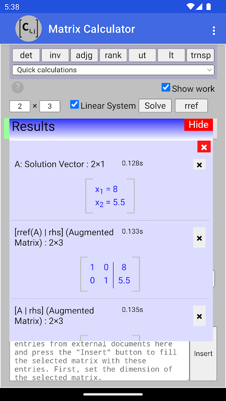 If a matrix expression is not listed under the quick calculation menu, you can enter it in the expression box provided. Press the Calculate button to evaluate it.