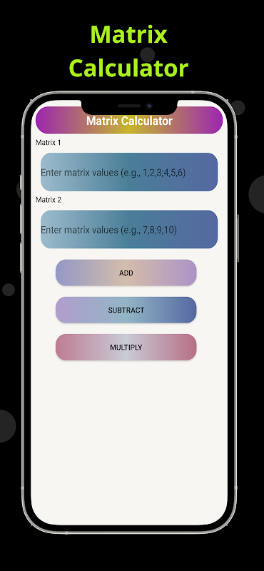 Simplify your matrix calculations with this handy Matrix Calculator app. Input your matrices using a straightforward format, select the desired operation (addition, subtraction, or multiplication), and get the results instantly. Features: