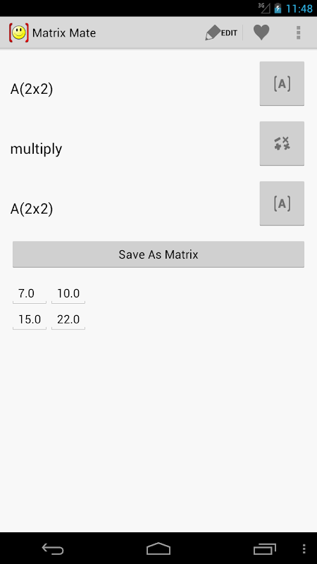 Matrix Mate is the most comprehensive matrix calculator available. With the largest list of available operations and a beautiful interface, optimized for Android phones and tablets from donut to jelly bean, what isn't there to love!