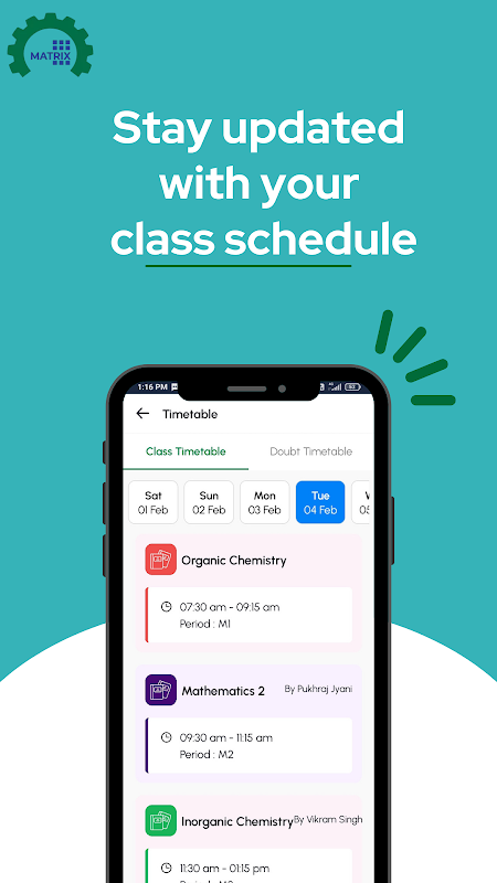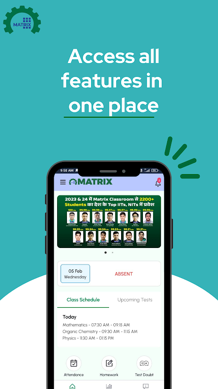 The Matrix App is your ultimate companion for academic success, designed exclusively for Matrix classroom students. Built on Matrix's 11-year legacy of excellence in coaching for JEE, NEET, Schooling, and Olympiads, this app brings the power of seamless learning right to your fingertips. Whether you need to stay updated with your academic schedule, track your progress, or seek expert guidance, the Matrix App has everything you need to excel.
