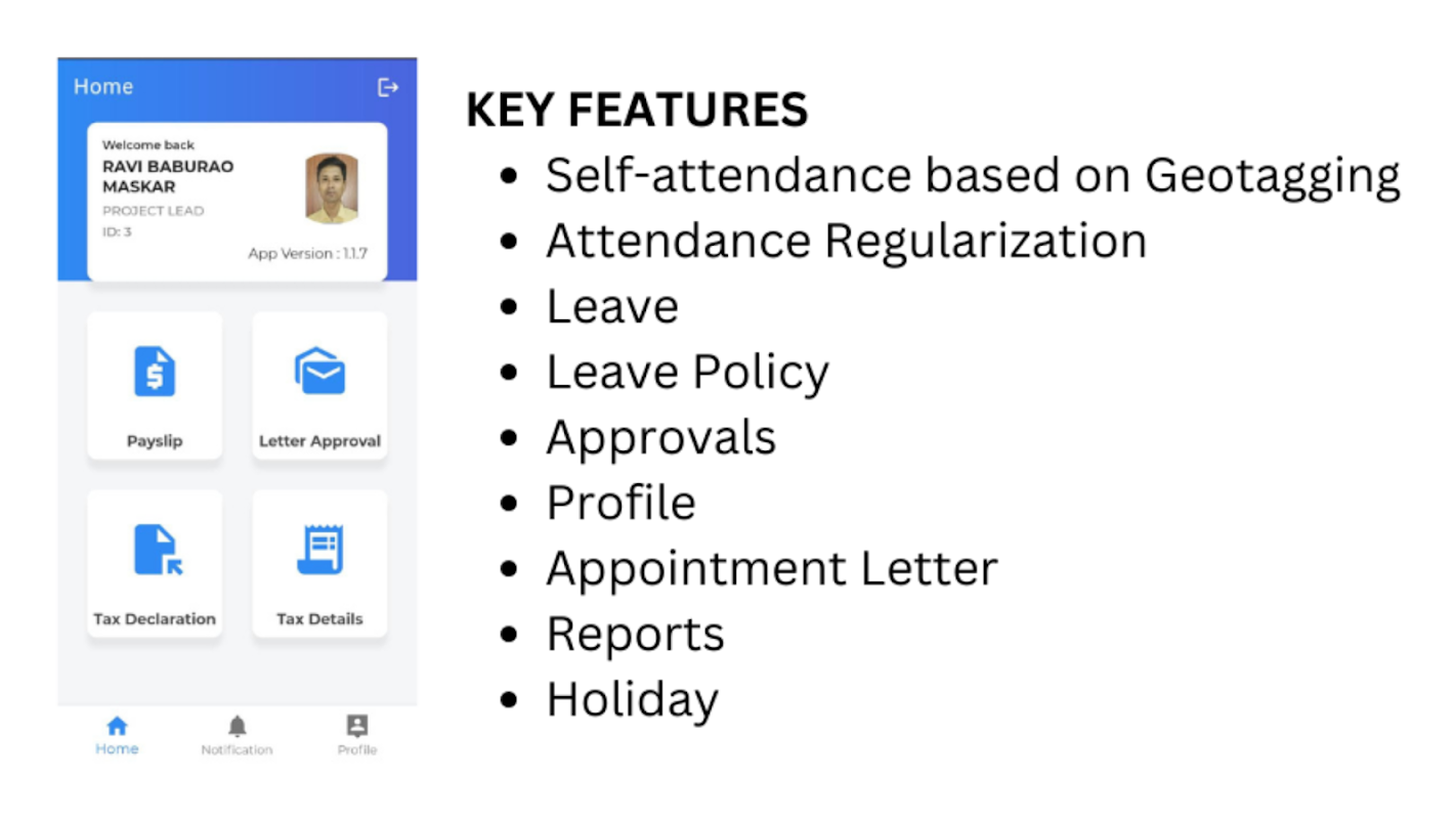 Employees can mark their own attendance and view and manage their leave application, regularize missed punch attendance, and view their Pay Slip, Appointment letter, and Offer Letter provided by the company. The ESS application also has a provision to view tax deductions.