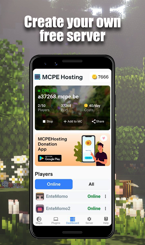 Our app offers you the possibility to get your own server for Minecraft Pocket Edition.