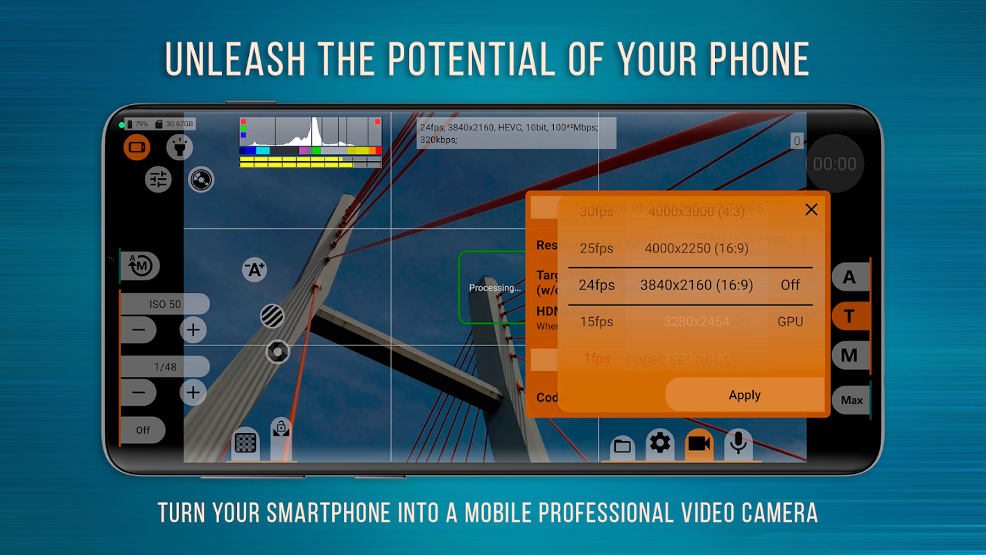 Perhaps the most powerful and advanced professional video camera app on Android! mcpro24fps will open up incredible cinematic possibilities in your phone, previously available only in professional camcorders.
