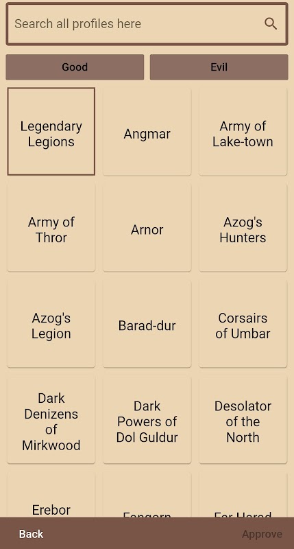 You can browse through SBG factions and legendary legions, or search by name to find the Lord of the Rings heroes you want. Profiles are automatically pulled down from the cloud whenever any changes are made.