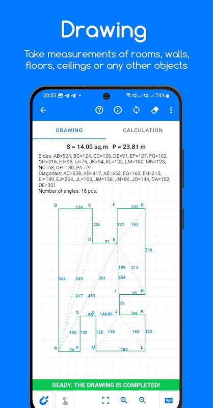 • Polygonal - Create complex shapes by specifying angles on the blueprint, and the app will automatically calculate the area and perimeter.