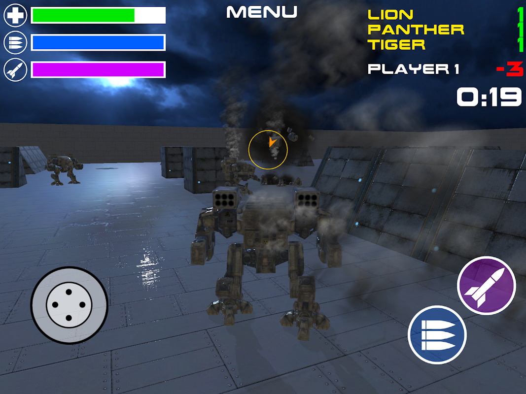 Battle against other robots in an arena to score as many points as you can within 5 minutes. Every time you destroy an enemy you gain 1 point and every time you are destroyed you lose 1 point.