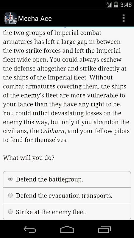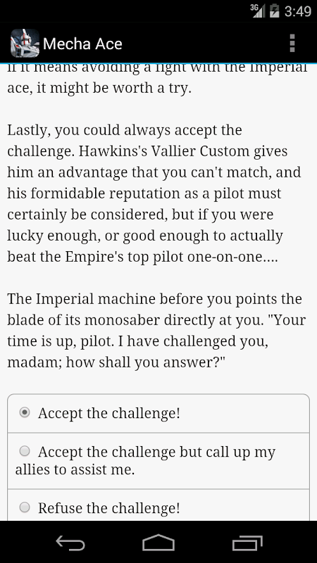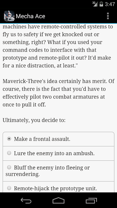 "Mecha Ace" is a thrilling interactive sci-fi novel by Paul Wang, where your choices control the story. The game is entirely text-based--without graphics or sound effects--and fueled by the vast, unstoppable power of your imagination.