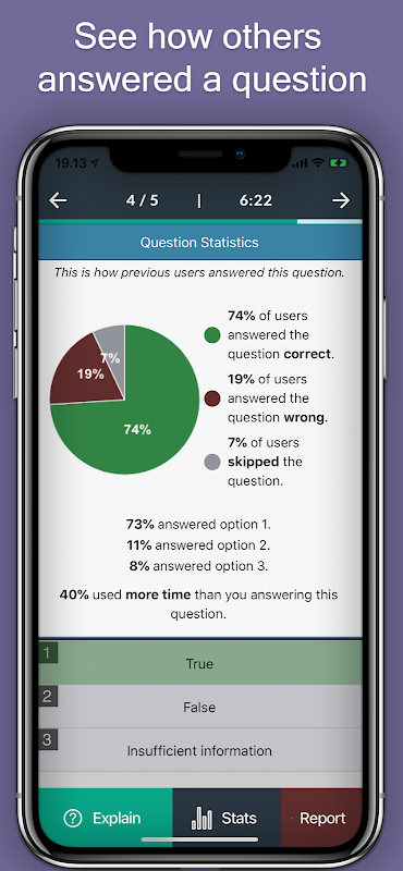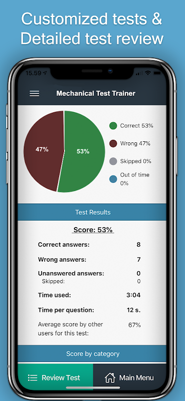 After each practice session your results with score are displayed, you can review questions and read a detailed explanation of almost every answer.