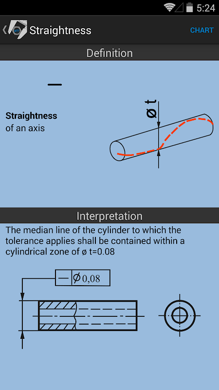 Geometrical Tolerances: Symbols, drawings and explanations as well as charts for the different geometrical tolerances.