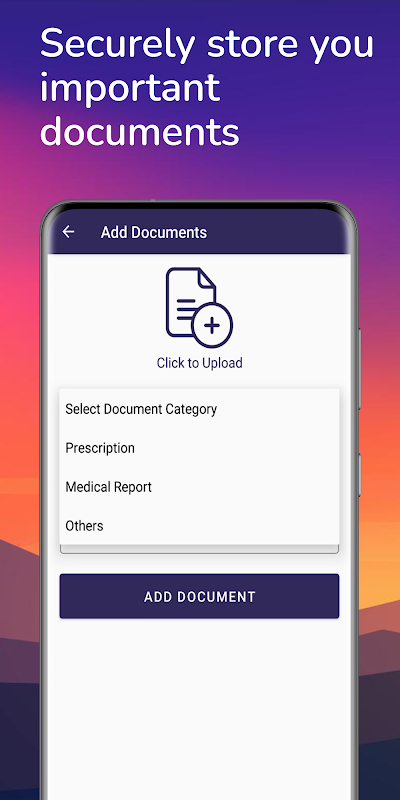 • Upload your medical documents (prescriptions, reports etc.) safely and securely on the cloud using end to end encryption.