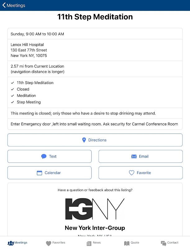Each meeting list view—In-Person and Online—has its own set of favorites. Tap the heart icon in the upper-left corner of a view to see the favorites you’ve saved there.