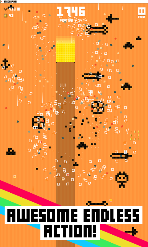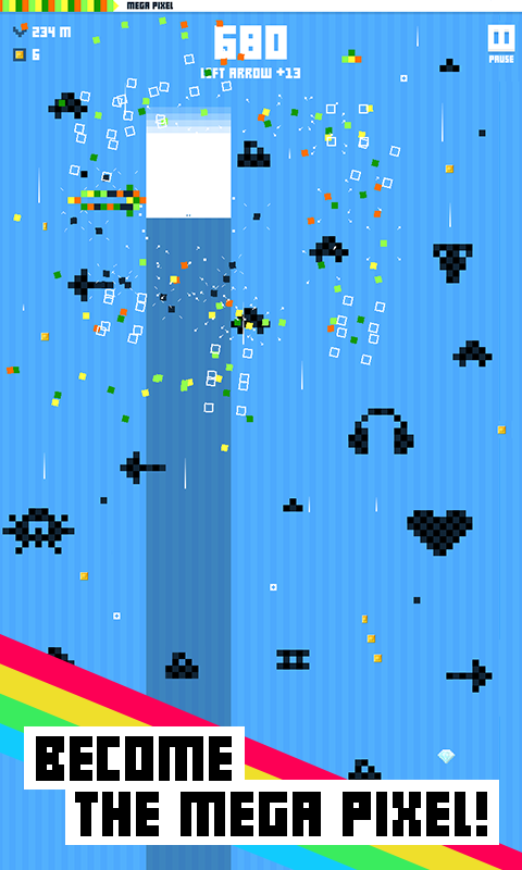 When pixels collide, it’s game over! Tap to steer your plucky pixel left and right as it descends through a minefield of dangerous retro shapes to build up your meter and transform into the almighty Mega Pixel.