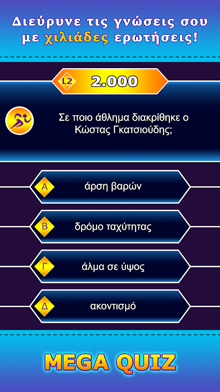 Welcome to the Mega Quiz, the game that aspires to become the favorite game of general knowledge in Greece and Cyprus. The new knowledge game allows you to test yourself in multiple choice questions through 10 categories. The Mega Quiz is and will always be free and waiting for you to play!
